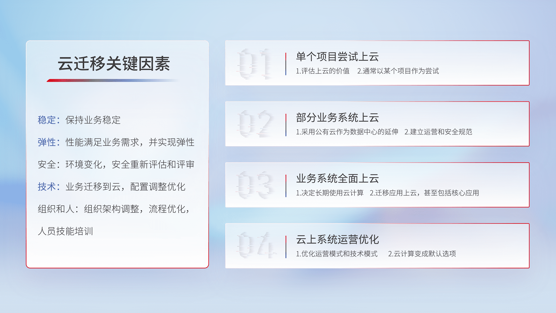 结合实际业务,,,从规划设计、、、、云平台选型、、云原生改造、、、、数据迁移、、、集成交付,,,迁移全过程为客户识别最佳上云路径,,,,做好风险识别管理,,设计网络架构、、、身份权限、、、、安全审计合规、、操作审计、、、、日志审计、、、、监控告警策略、、、、多站点容灾设计等,,,对云上基础设施进行整体规划,,,提升IT治理水平,,以满足弹性、、、、高可用、、、、高性能的需求。。。