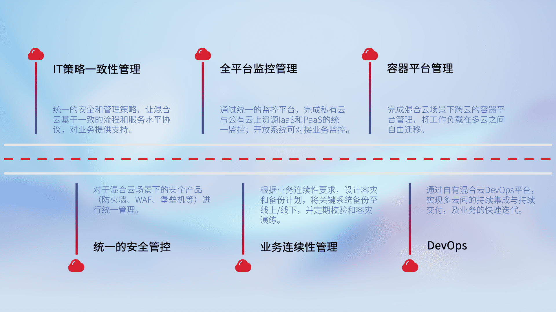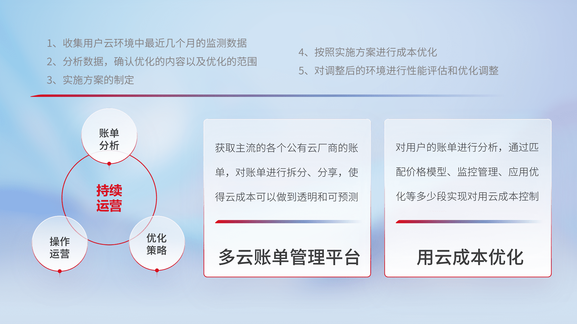 通过多云纳管,,以统一的资源数据模型把客户的云资源进行抽象和封装,,,,进而实现对多云资源的统一操作,,,保障云资源管理的可靠性、、、、稳定性与可用性。。量身定制化运维内容,,,配置、、开发运维、、补丁管理、、、备份、、、、监控、、、、认证和访问管理、、、、审计和日常巡检等,,,,保障在用云过程中的可靠度,,,,稳定度以及高可用率。。