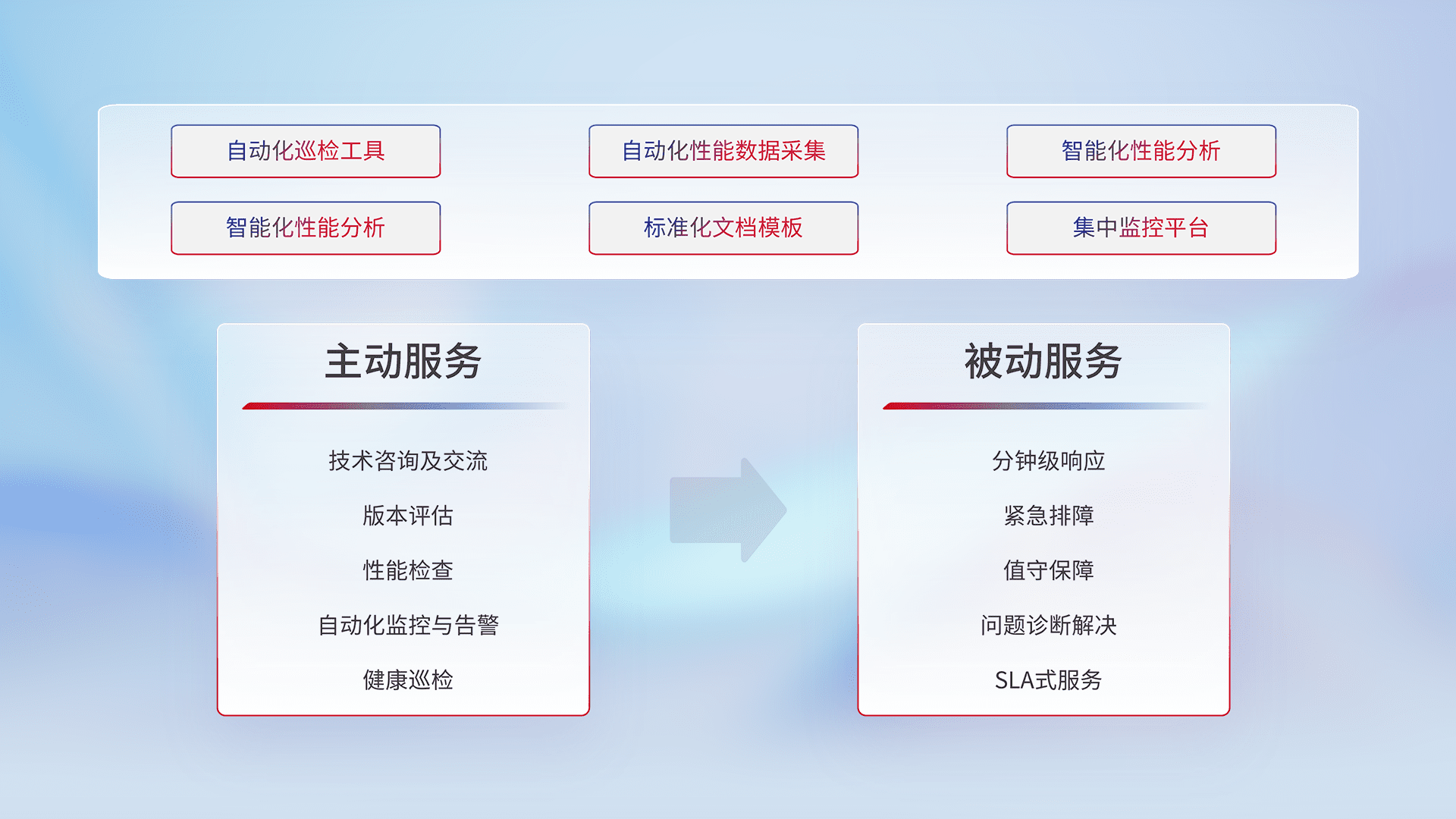 智能化工具和标准化文档,,保障服务质量,,,提供主动服务(包含技术咨询、、、版本评估、、、性能检查、、自动化监控与告警、、健康巡检)和被动服务包含(分钟级响应、、紧急排障、、值守保障、、、、问题诊断解决、、、SLA服务)。。